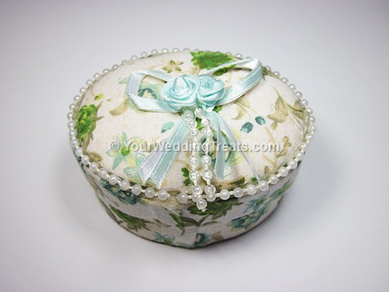 This white oval shaped jewelry box is an exquisite and charming gift for most wedding occasions, and being covered by cloth/fabric, if you apply some scent by spraying some perfume onto them and inserting a brooch inside them, they would be the perfect wedding favor!